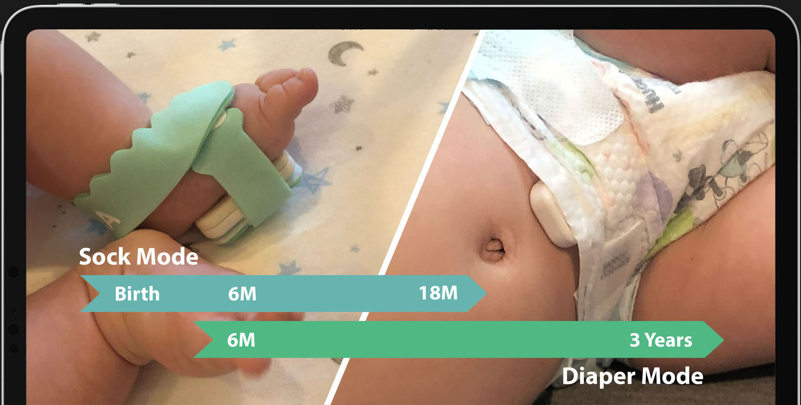 Supporting the 'Diaper Mode' is very necessary because babies over 6-month-old start to grab and strip socks. The NORA sensor is able to hide in the diaper, draws little attention and allows a much longer use to 3-years-old.